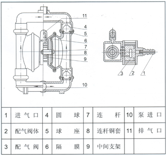 在QBY氣動隔膜泵的兩個對稱工作腔中,各裝有一塊有彈性的隔膜6,聯(lián)桿將兩塊隔膜結(jié)成一體,壓縮空氣從泵的進(jìn)氣接頭1進(jìn)入配氣閥3后,推動兩個工作腔內(nèi)的隔膜,驅(qū)使聯(lián)桿聯(lián)接的兩塊隔膜同步運動。與此同時,另一工作腔中的氣體則從隔膜的背后排出泵外。一旦到達(dá)行程終點。配氣機構(gòu)則自動地將壓縮空氣引入另一個工作腔,推動隔膜朝相反方向運動,這樣就形成了兩個隔膜的同步往復(fù)運動。每個工作腔中設(shè)置有兩個單向球閥4,隔膜的往復(fù)運動,造成工作腔內(nèi)容積的改變,迫使兩個單向球閥交替地開啟和關(guān)閉,從而將液體連續(xù)地吸入和排出。